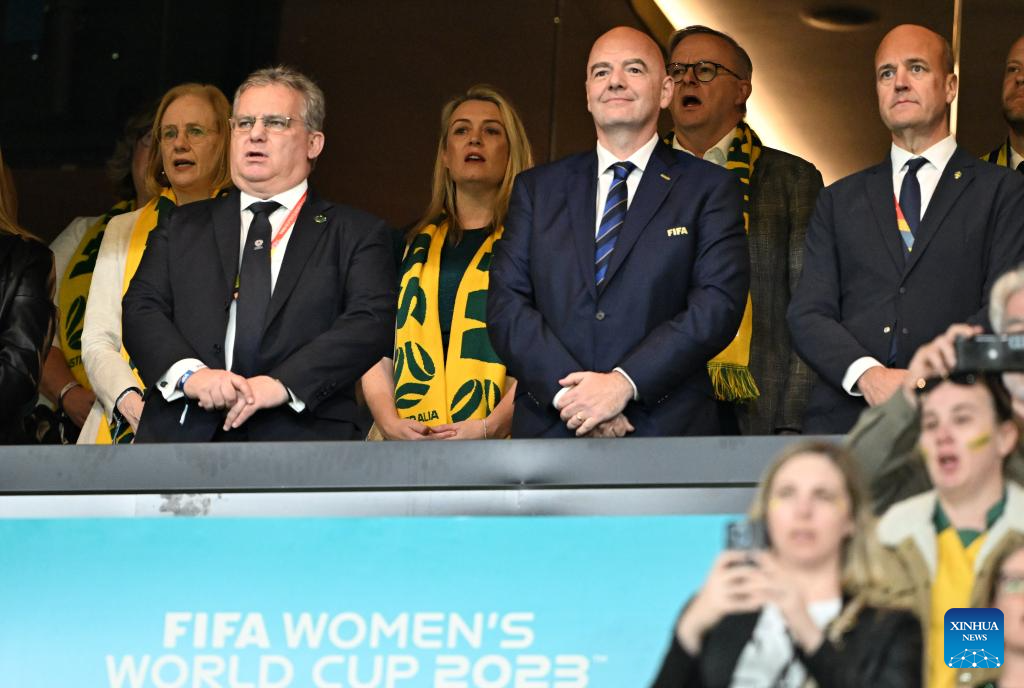 FIFA President Gianni Infantino (3rd R, top) is seen in the stands before the third place play-off between Sweden and Australia at the 2023 FIFA Women's World Cup in Brisbane, Australia, Aug. 19, 2023. (Xinhua/Li Yibo)