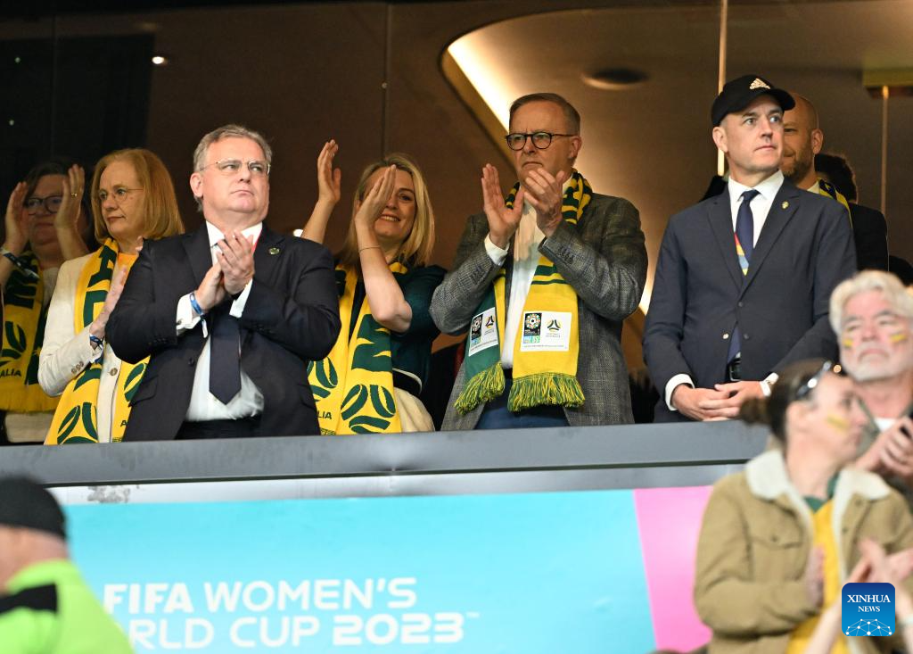 Australian Prime Minister Anthony Albanese (2nd R, top) is seen in the stands before the third place play-off between Sweden and Australia at the 2023 FIFA Women's World Cup in Brisbane, Australia, Aug. 19, 2023. (Xinhua/Li Yibo)