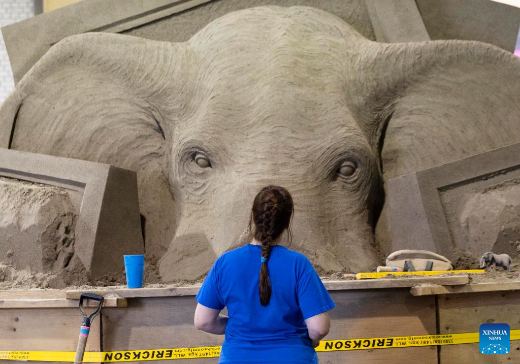 An artist looks at her sand sculpture during the 2023 Canadian National Exhibition (CNE) in Toronto, Canada, on Aug. 18, 2023. As one of the largest community events in Canada, the annual 18-day exhibition kicked off here on Friday. (Photo by Zou Zheng/Xinhua)