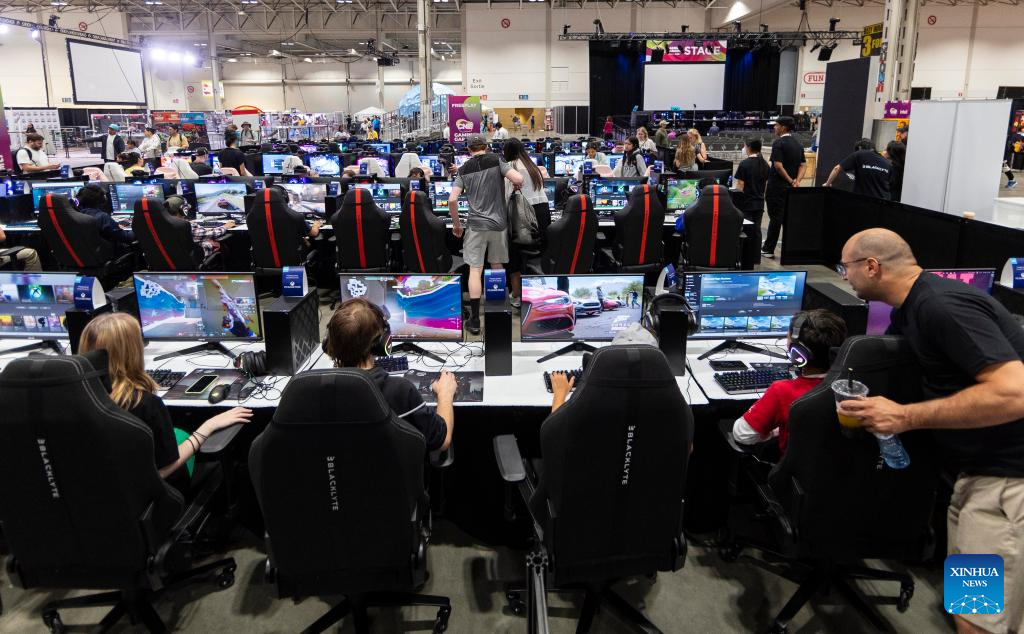People play video games during the 2023 Canadian National Exhibition (CNE) in Toronto, Canada, on Aug. 18, 2023. As one of the largest community events in Canada, the annual 18-day exhibition kicked off here on Friday. (Photo by Zou Zheng/Xinhua)