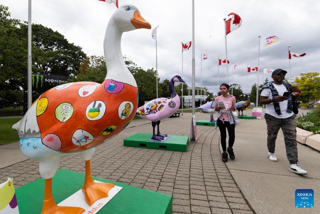 People walk past a group of goose statues on display during the 2023 Canadian National Exhibition (CNE) in Toronto, Canada, on Aug. 18, 2023. As one of the largest community events in Canada, the annual 18-day exhibition kicked off here on Friday. (Photo by Zou Zheng/Xinhua)