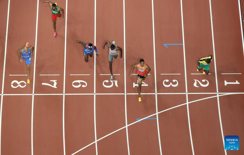 Noah Lyles (1st below) of the United States competes during the men's 100m heat of the World Athletics Championships Budapest 2023 in Budapest, Hungary on Aug. 19, 2023. (Xinhua/Li Ming)