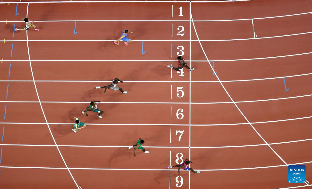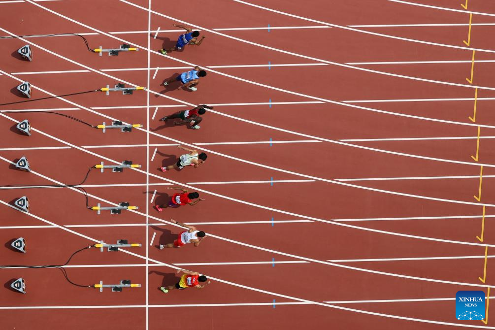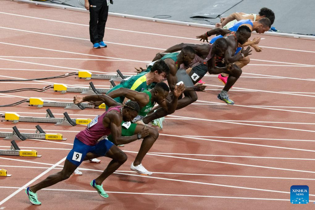 Athletes start during the men's 100m preliminary round heat 1 of the World Athletics Championships Budapest 2023 at the National Athletics Centre stadium in Budapest, Hungary on Aug. 19, 2023. (Xinhua/Zheng Huansong)