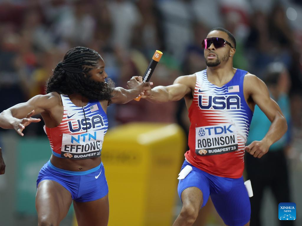 Alexis Holmes (R) and Justin Robinson of the United States compete during the 4x400m Relay Mixed Final of the World Athletics Championships Budapest 2023 in Budapest, Hungary on Aug. 19, 2023. (Xinhua/Meng Dingbo)