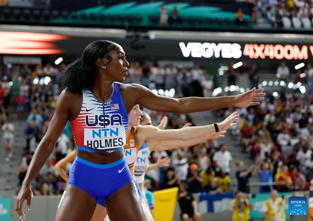 Alexis Holmes (R) of the United States crosses the finish line as Femke Bol of the Netherlands looks on during the 4x400m Relay Mixed Final of the World Athletics Championships Budapest 2023 in Budapest, Hungary on Aug. 19, 2023. (Xinhua/Meng Dingbo)