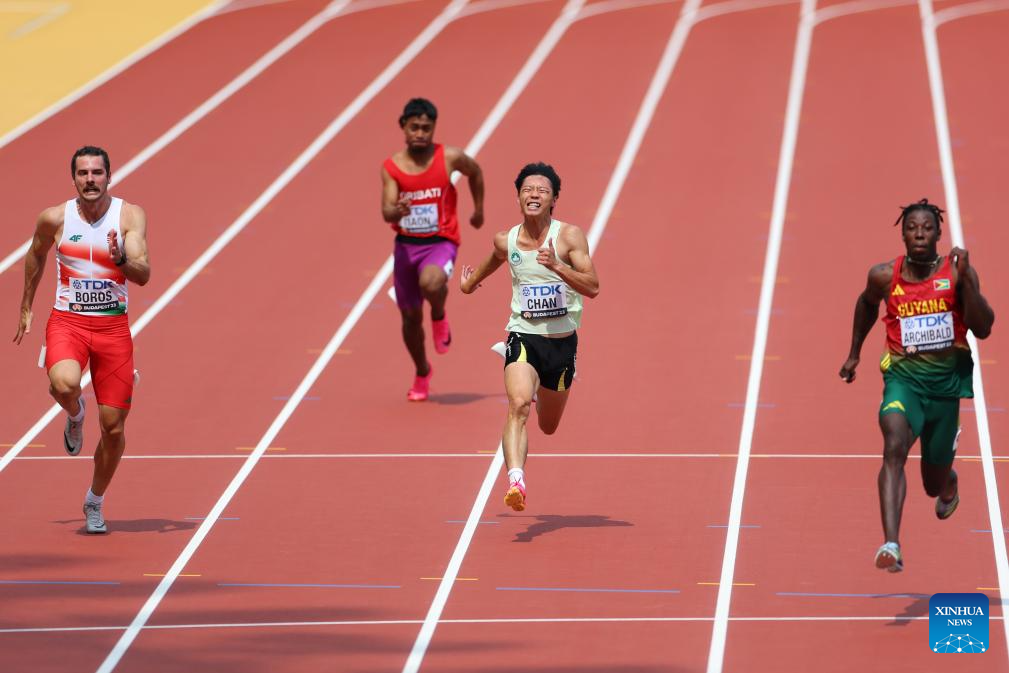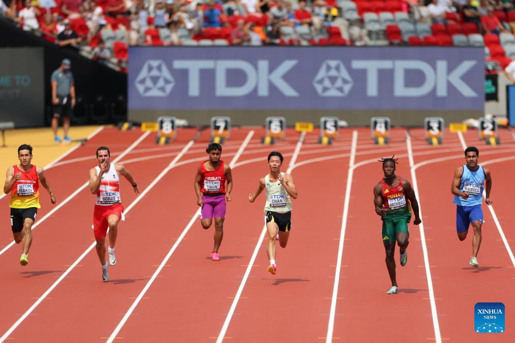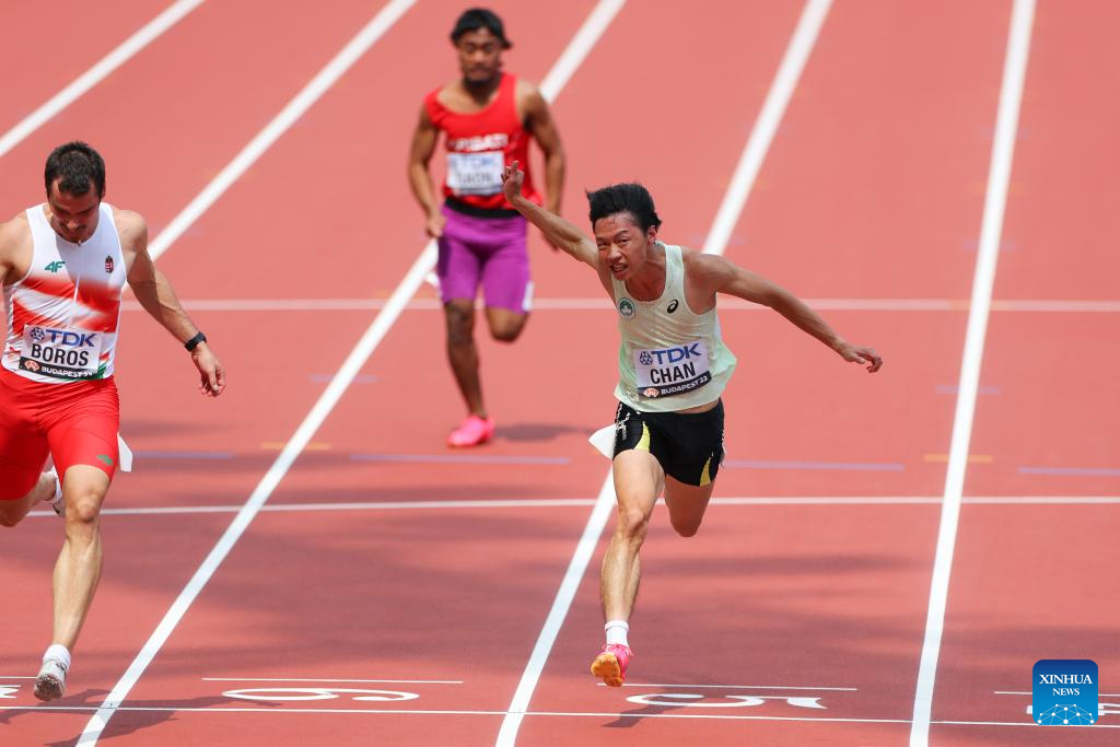 Chan Kin Wa (R) of China's Macao competes during the men's 100m preliminary round heat 1 of the World Athletics Championships Budapest 2023 at the National Athletics Centre stadium in Budapest, Hungary on Aug. 19, 2023. (Xinhua/Zheng Huansong)