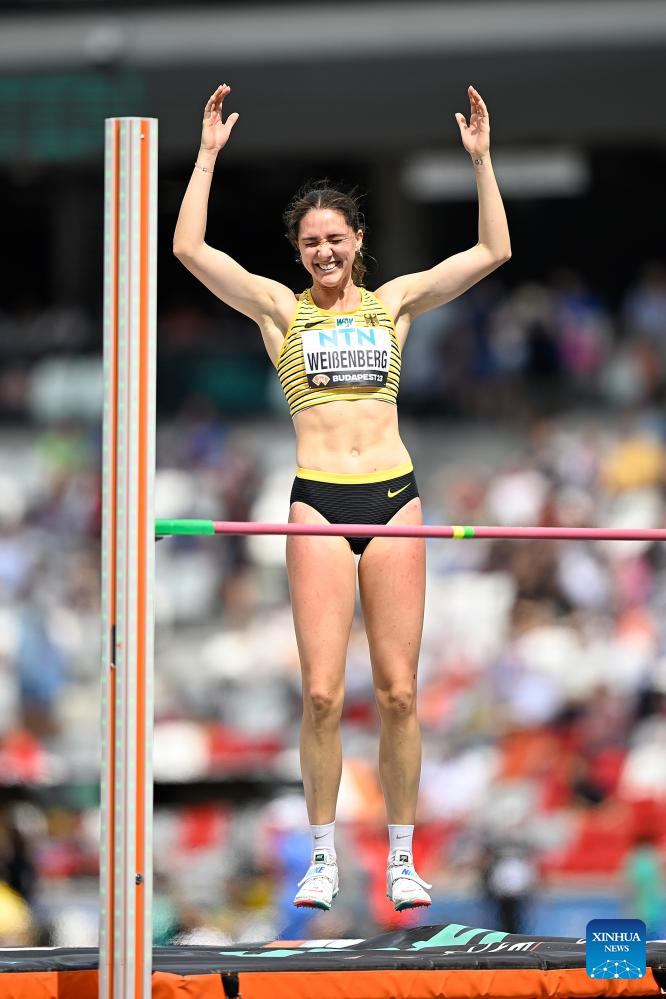 Sophie Weissenberg of Germany reacts during the high jump of Women's Heptathlon of the World Athletics Championships Budapest 2023 at the National Athletics Centre stadium in Budapest, Hungary on Aug. 19, 2023. (Xinhua/Song Yanhua)
