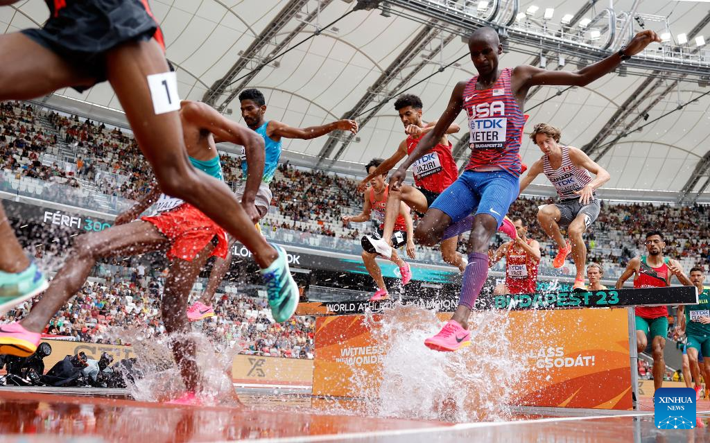 The United States' Benard Keter (front R) competes during the 3000m Steeplechase Men Heats of the World Athletics Championships Budapest 2023 at the National Athletics Centre stadium in Budapest, Hungary on Aug. 19, 2023. (Xinhua/Wang Lili)