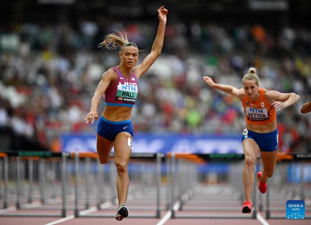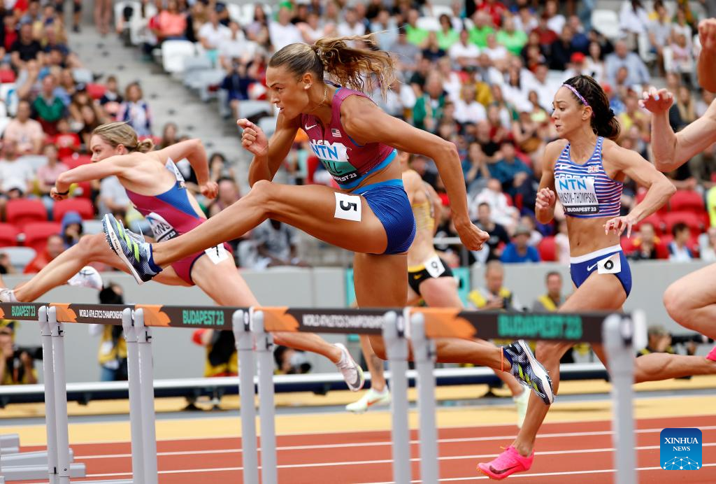 Anna Hall (L) of the United States competes during the 100m Hurdles of Women's Heptathlon of the World Athletics Championships Budapest 2023 at the National Athletics Centre stadium in Budapest, Hungary on Aug. 19, 2023. (Xinhua/Song Yanhua)