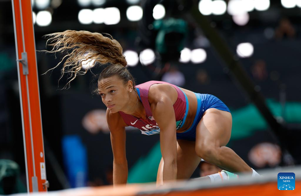 Anna Hall of the United States competes during the High Jump of Women's Heptathlon at the World Athletics Championships Budapest 2023 in Budapest, Hungary on Aug. 19, 2023. (Xinhua/Wang Lili)