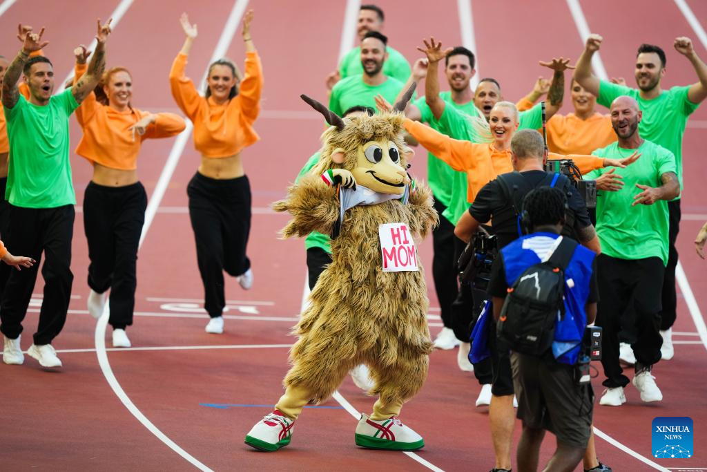 Mascot 'Youhuu' performs during the opening ceremony of the World Athletics Championships Budapest 2023 in Budapest, Hungary on Aug. 19, 2023. (Xinhua/Zheng Huansong)