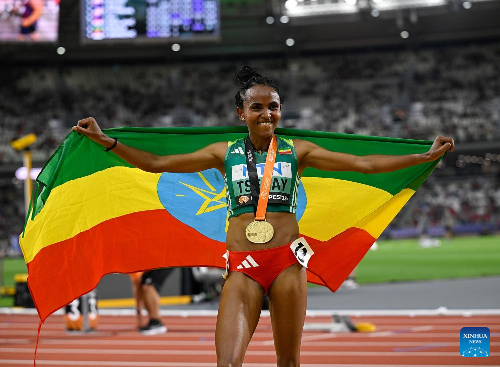 Gudaf Tsegay of Ethiopia celebrates after the women's 10000m Final of the World Athletics Championships Budapest 2023 in Budapest, Hungary on Aug. 19, 2023. (Xinhua/Song Yanhua)