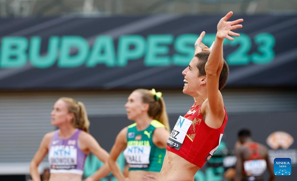 Marta Perez (R) of Spain celebrates after the women's 1500m heat of the World Athletics Championships Budapest 2023 in Budapest, Hungary on Aug. 19, 2023. (Xinhua/Wang Lili)