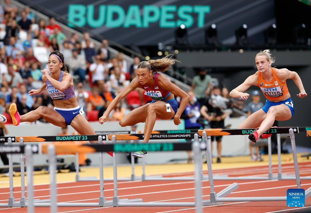 Katarina Johnson-Thompson of Britain, Anna Hall of the United States and Anouk Vetter of the Netherlands (L to R) compete during the 100m Hurdles of Women's Heptathlon at the World Athletics Championships Budapest 2023 in Budapest, Hungary on Aug. 19, 2023. (Xinhua/Wang Lili)