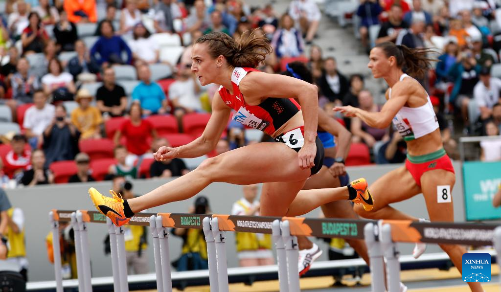 Annik Kalin (front) of Switzerland competes during the 100m Hurdles of Women's Heptathlon at the World Athletics Championships Budapest 2023 in Budapest, Hungary on Aug. 19, 2023. (Xinhua/Wang Lili)