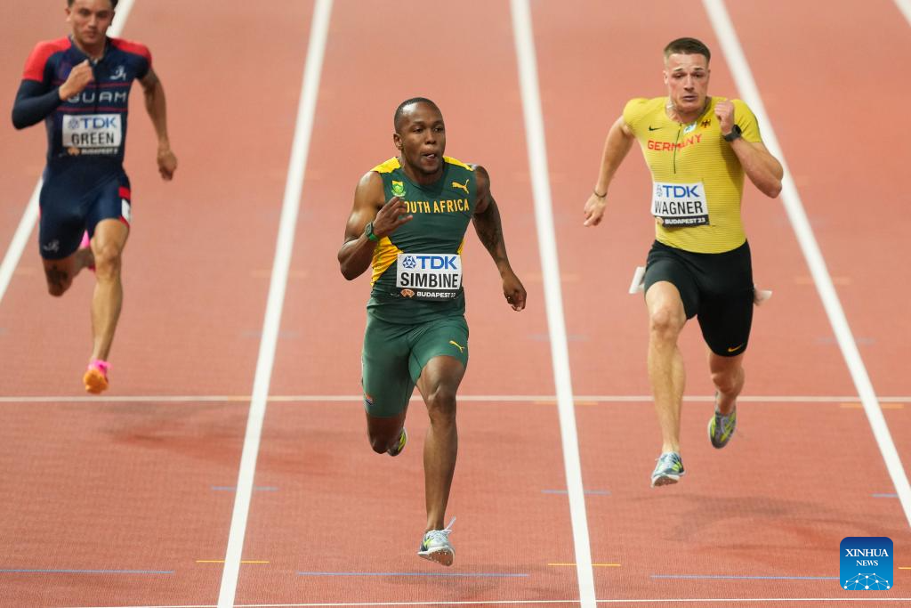 Akani Simbine (C) of South Africa competes during the men's 100m heat of the World Athletics Championships Budapest 2023 in Budapest, Hungary on Aug. 19, 2023. (Xinhua/Zheng Huansong)
