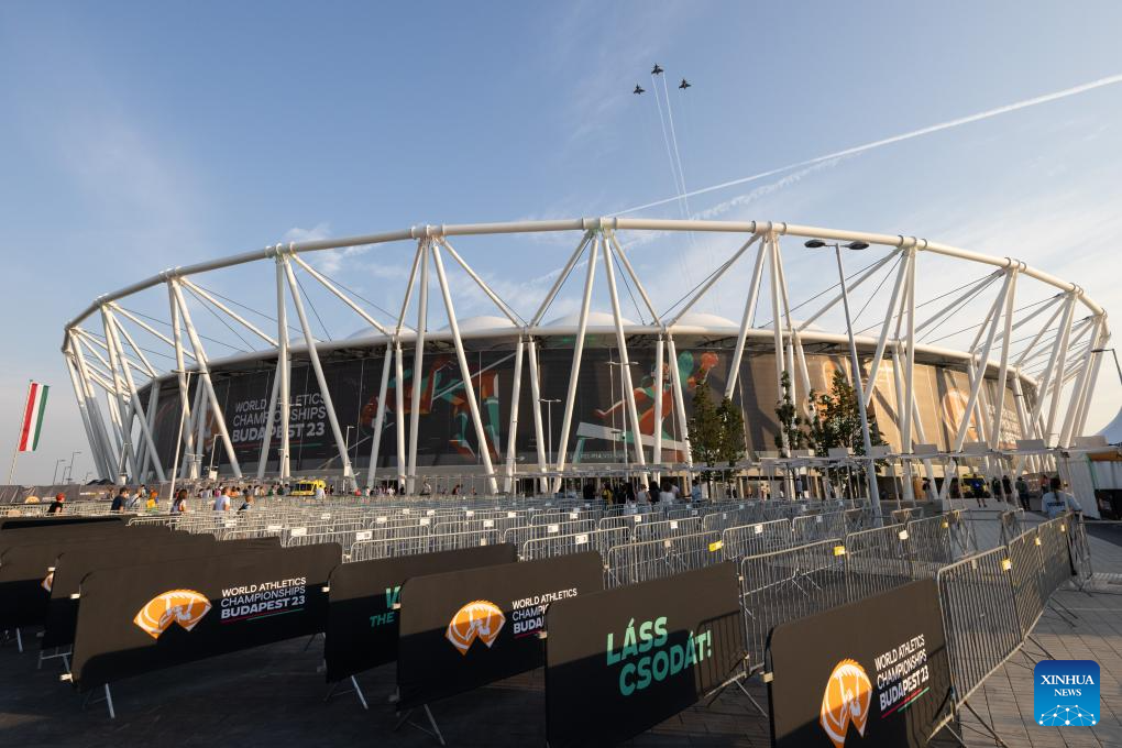 Jas 39 Gripen fighters of Hungarian Air Force fly over the National Athletics Centre during the opening ceremony of the World Athletics Championships Budapest 2023 in Budapest, Hungary on Aug. 19, 2023. (Photo by Attila Volgyi/Xinhua)