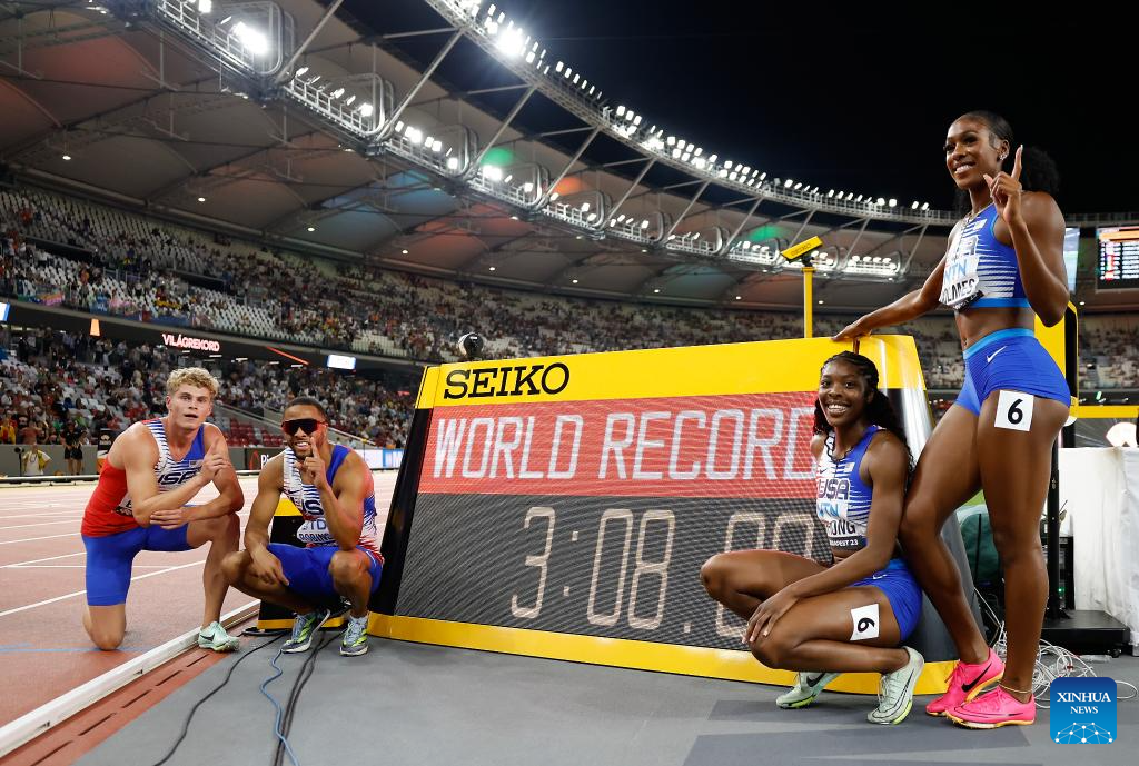 Team the United States celebrate after the 4x400m Relay Mixed Final of the World Athletics Championships Budapest 2023 in Budapest, Hungary on Aug. 19, 2023. (Xinhua/Li Ying)