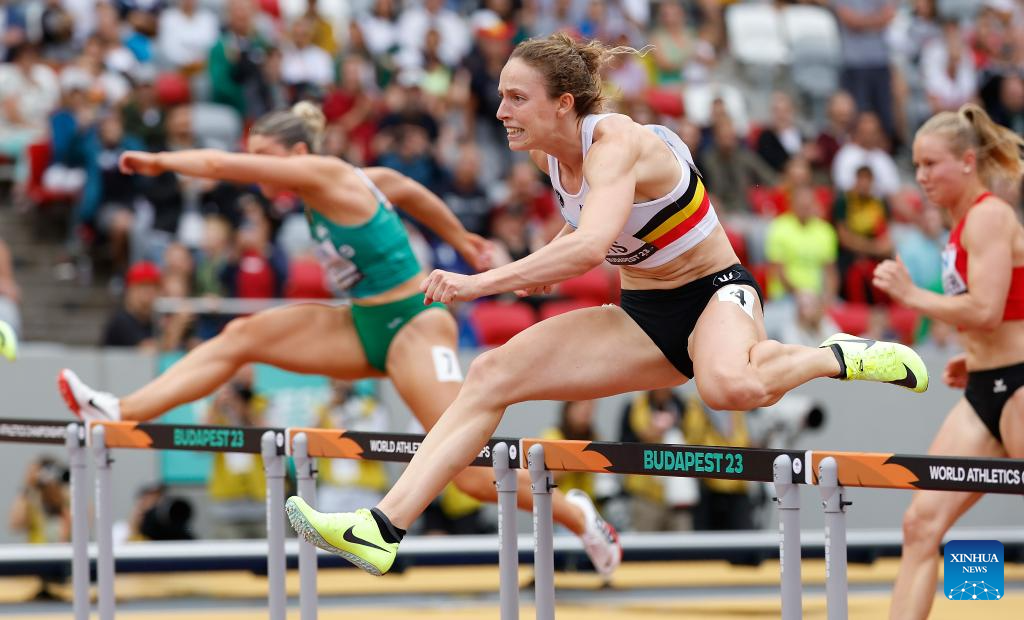 Noor Vidts (front) of Belgium competes during the 100m Hurdles of of Women's Heptathlon at the World Athletics Championships Budapest 2023 in Budapest, Hungary on Aug. 19, 2023. (Xinhua/Wang Lili)