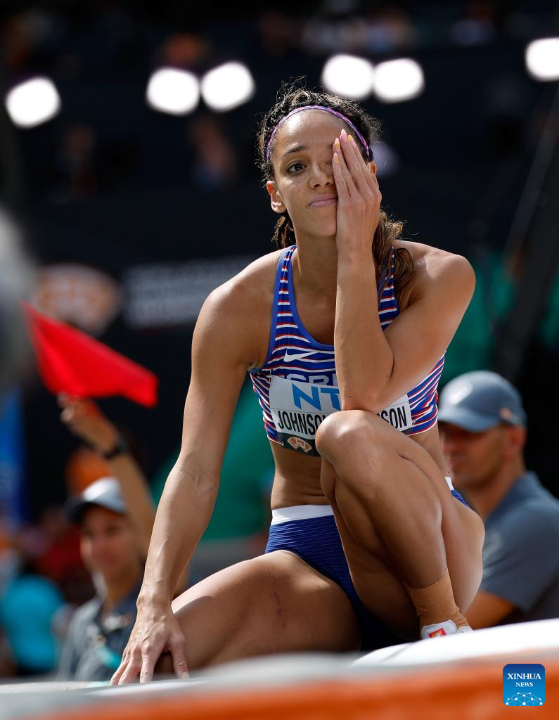 Katarina Johnson-Thompson of Britain reacts during the High Jump of Women's Heptathlon at the World Athletics Championships Budapest 2023 in Budapest, Hungary on Aug. 19, 2023. (Xinhua/Wang Lili)