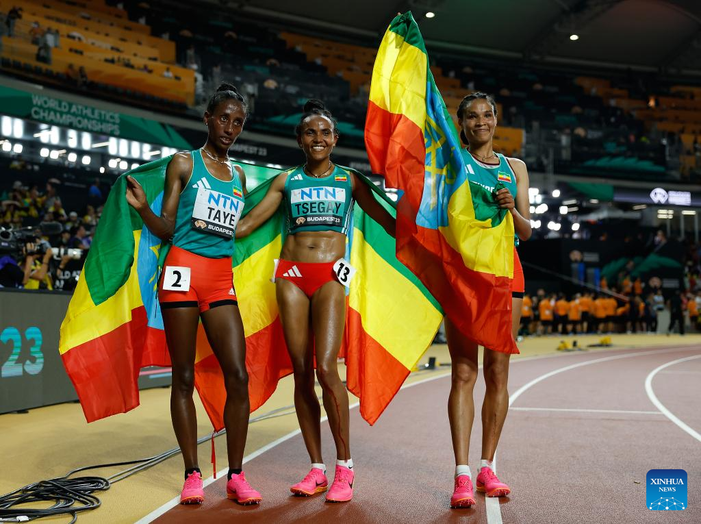 Gudaf Tsegay (C), Letesenbet Gidey (R) and Ejgayehu Taye of Ethiopia celebrate after the women's 10000m Final of the World Athletics Championships Budapest 2023 in Budapest, Hungary on Aug. 19, 2023. (Xinhua/Wang Lili)