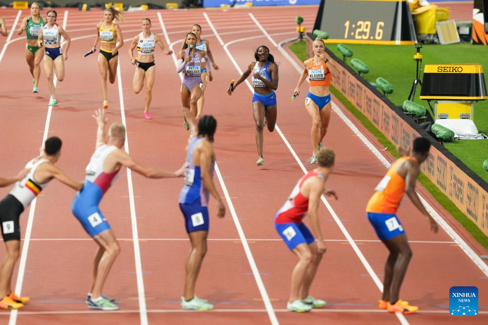 Athletes compete during the 4x400m Relay Mixed Final of the World Athletics Championships Budapest 2023 in Budapest, Hungary on Aug. 19, 2023. (Xinhua/Zheng Huansong)