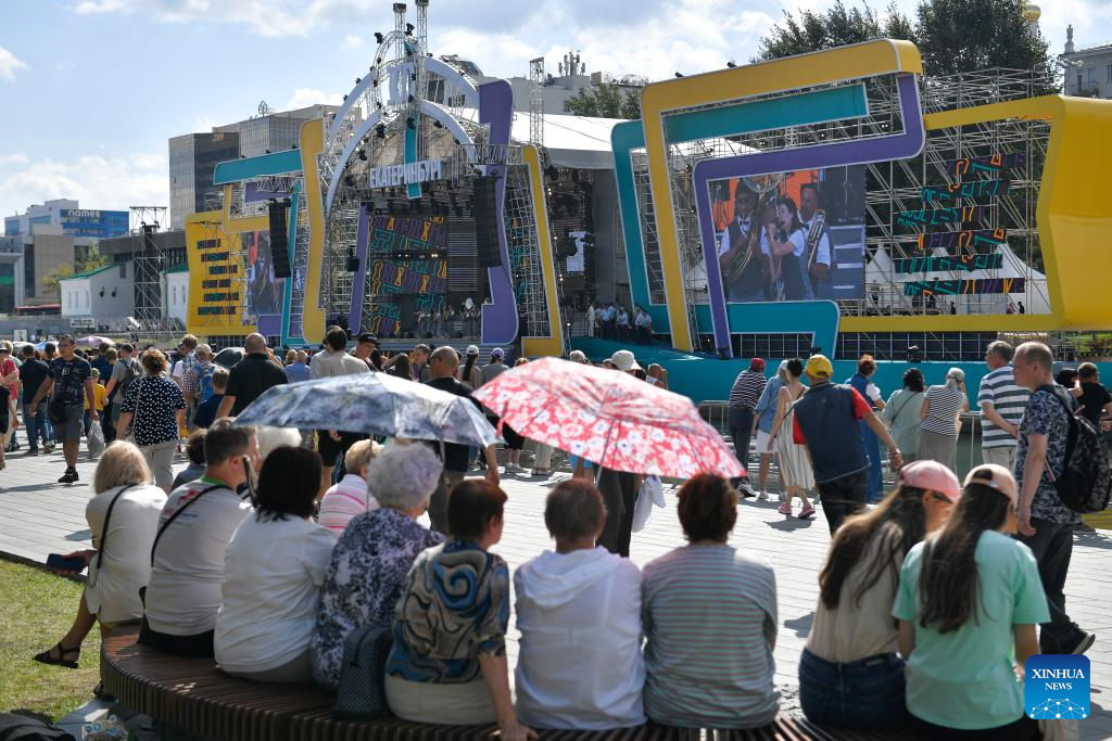 People watch a brass band's performance in Ekaterinburg, Russia, on Aug. 19, 2023. Celebrations were held Saturday in Ekaterinburg to mark the 300th anniversary of the foundation of the city. (Photo by Alexander Zemlianichenko Jr/Xinhua)