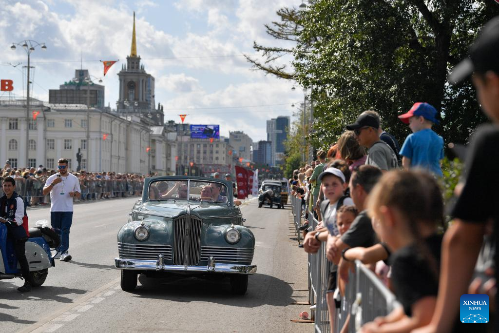 People watch a retro car parade in Ekaterinburg, Russia, on Aug. 19, 2023. Celebrations were held Saturday in Ekaterinburg to mark the 300th anniversary of the foundation of the city. (Photo by Alexander Zemlianichenko Jr/Xinhua)
