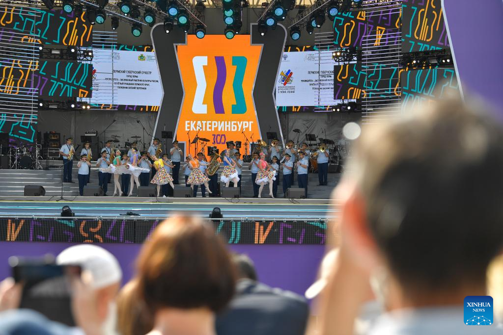Artists perform at a park in Ekaterinburg, Russia, on Aug. 19, 2023. Celebrations were held Saturday in Ekaterinburg to mark the 300th anniversary of the foundation of the city. (Photo by Alexander Zemlianichenko Jr/Xinhua)