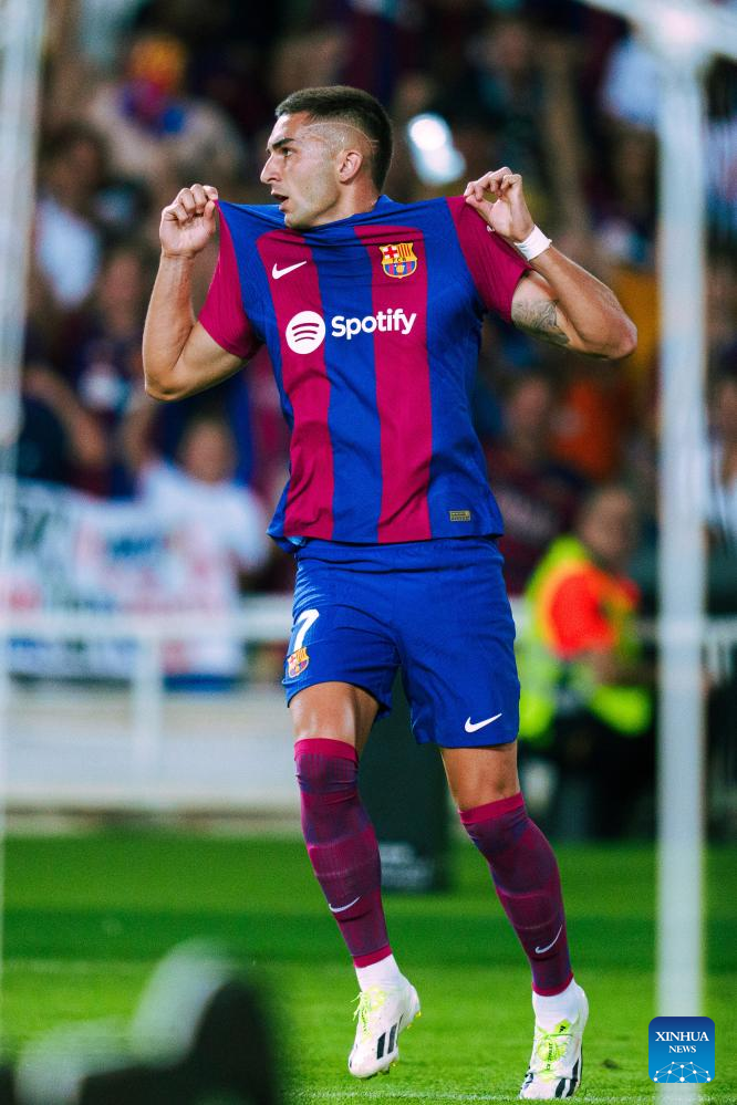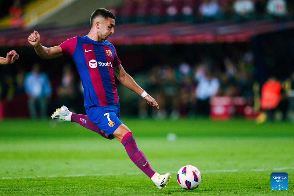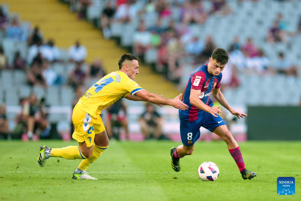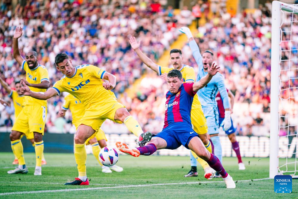 MADRID, Aug. 21 (Xinhua) -- FC Barcelona were pushed to their limits in a 2-0 victory over Cadiz during their inaugural league match at the Montjuic Stadium in Barcelona on Sunday night.
