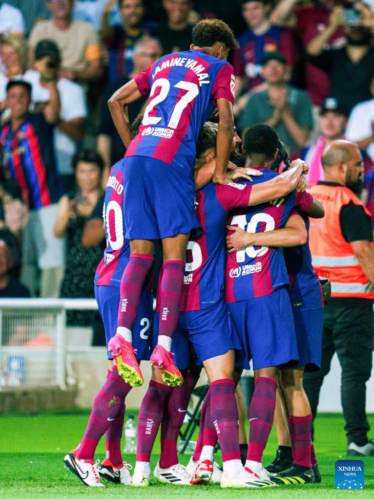 Players of Barcelona celebrate a goal during the Spanish La Liga football match between FC Barcelona and Cadiz CF in Barcelona, Spain, Aug. 20, 2023. (Photo by Joan Gosa/Xinhua)