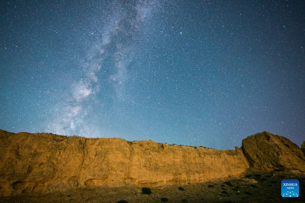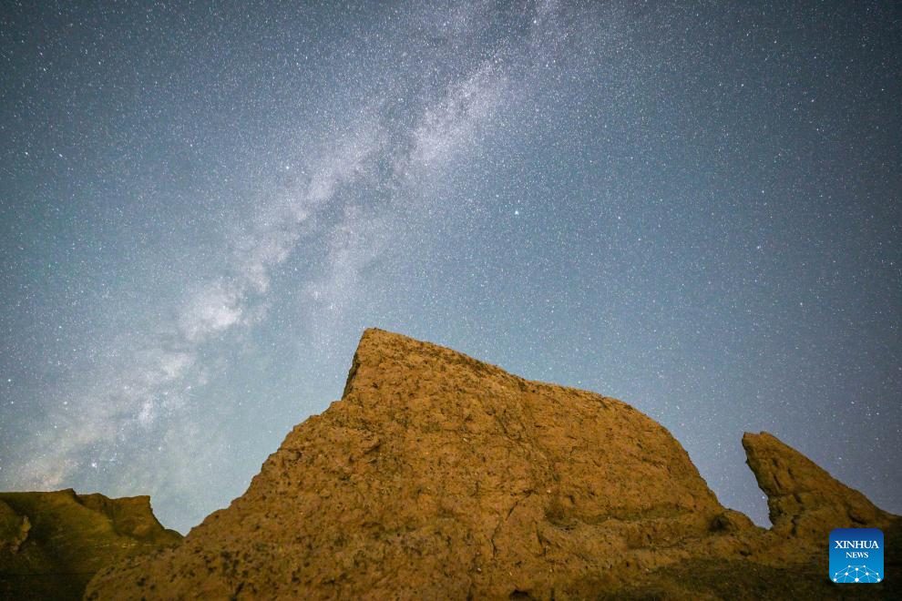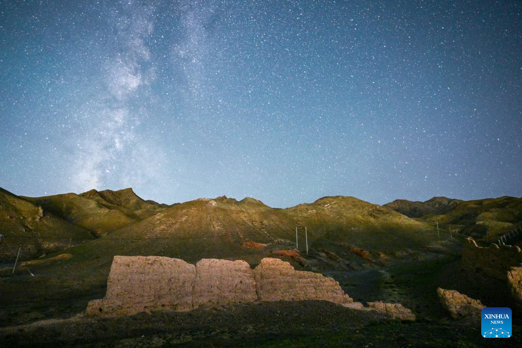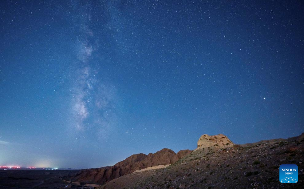 This long-time exposure photo taken on Aug. 20, 2023 shows a section of the Great Wall built in Ming dynasty (1368-1644) under the starry night sky in north China. (Xinhua/Liu Jinhai)