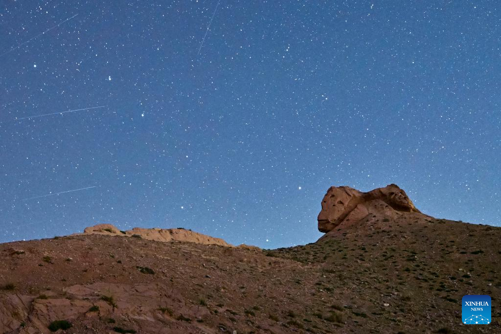 This long-time exposure photo taken on Aug. 21, 2023 shows a section of the Great Wall built in Ming dynasty (1368-1644) under the starry night sky in north China. (Xinhua/Liu Jinhai)