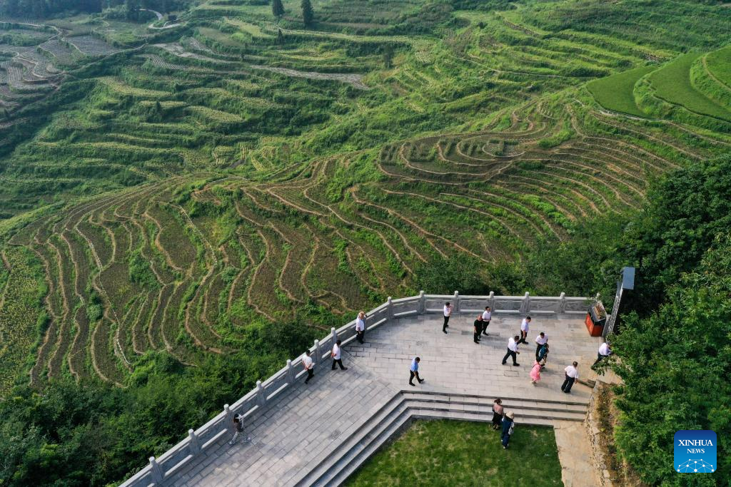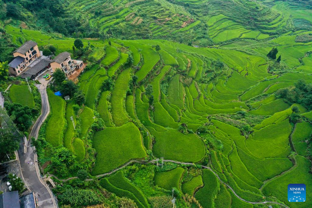 This aerial photo taken on Aug. 19, 2023 shows terraced fields in Dingshi Township, Youyang Tujia and Miao Autonomous County, southwest China's Chongqing Municipality. Youyang, one of the key beneficiary counties of state assistance for rural revitalization, has been fully availing of its unique advantages in ecological environment and indigenous tradition to promote converged development of agriculture, culture, and tourism. (Xinhua/Wang Quanchao)