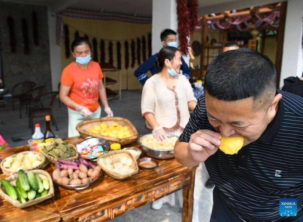 A visitor tastes specialty food in Dingshi Township, Youyang Tujia and Miao Autonomous County, southwest China's Chongqing Municipality, on Aug. 20, 2023. Youyang, one of the key beneficiary counties of state assistance for rural revitalization, has been fully availing of its unique advantages in ecological environment and indigenous tradition to promote converged development of agriculture, culture, and tourism. (Xinhua/Wang Quanchao)