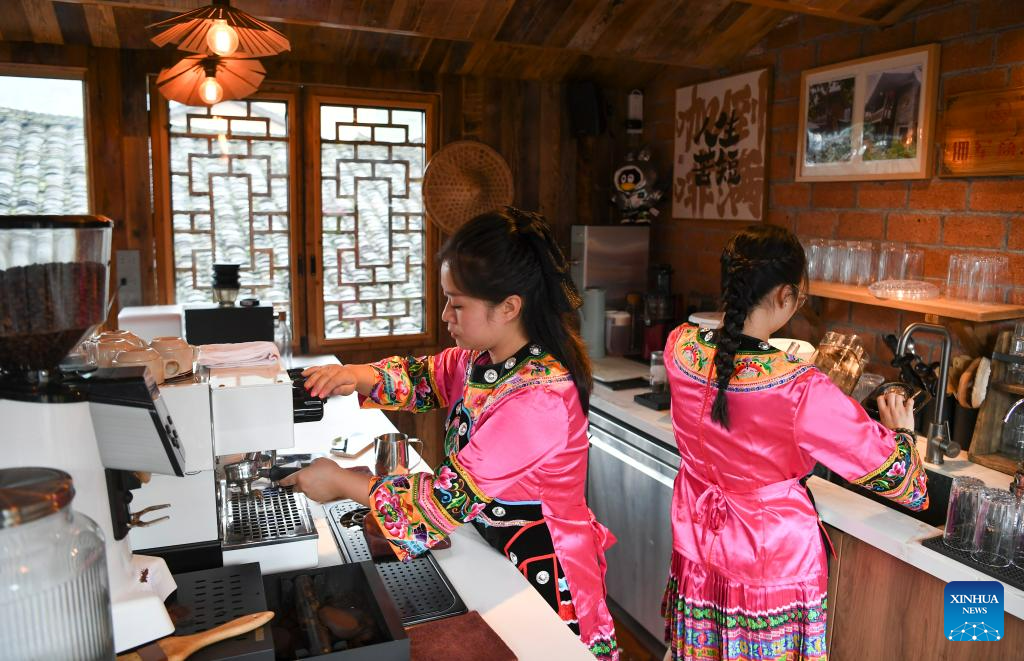 Staff members prepare drinks at a cafe in Huatian Township, Youyang Tujia and Miao Autonomous County, southwest China's Chongqing Municipality, on Aug. 20, 2023. Youyang, one of the key beneficiary counties of state assistance for rural revitalization, has been fully availing of its unique advantages in ecological environment and indigenous tradition to promote converged development of agriculture, culture, and tourism. (Xinhua/Wang Quanchao)