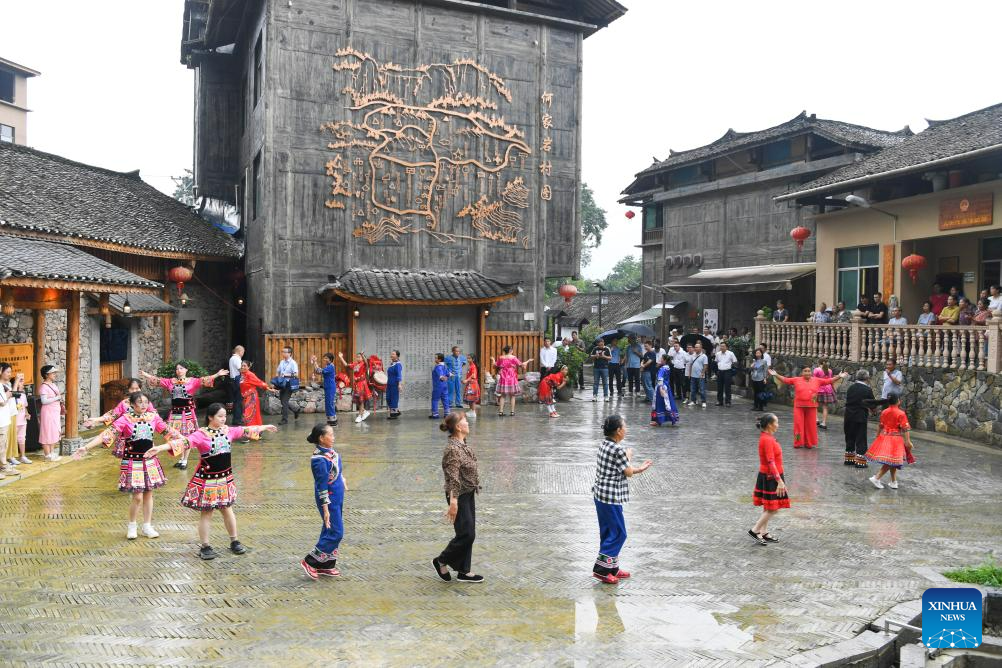 Villagers perform a dance of the Tujia ethnic group for visitors in Huatian Township, Youyang Tujia and Miao Autonomous County, southwest China's Chongqing Municipality, on Aug. 20, 2023. Youyang, one of the key beneficiary counties of state assistance for rural revitalization, has been fully availing of its unique advantages in ecological environment and indigenous tradition to promote converged development of agriculture, culture, and tourism. (Xinhua/Wang Quanchao)