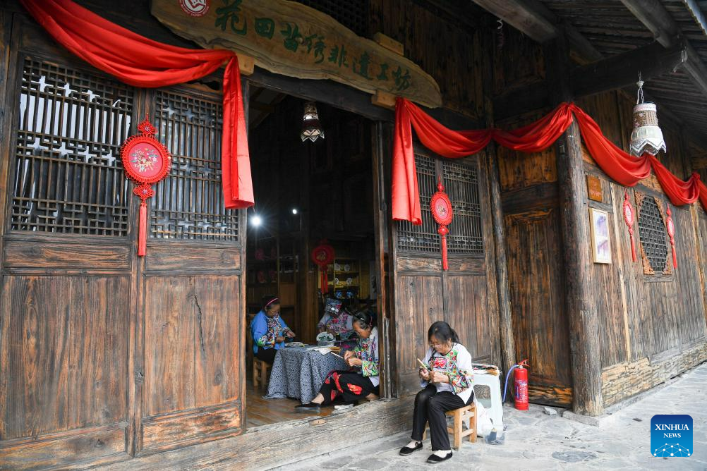 Villagers make embroidery of the Miao ethnic group in Huatian Township, Youyang Tujia and Miao Autonomous County, southwest China's Chongqing Municipality, on Aug. 20, 2023. Youyang, one of the key beneficiary counties of state assistance for rural revitalization, has been fully availing of its unique advantages in ecological environment and indigenous tradition to promote converged development of agriculture, culture, and tourism. (Xinhua/Wang Quanchao)