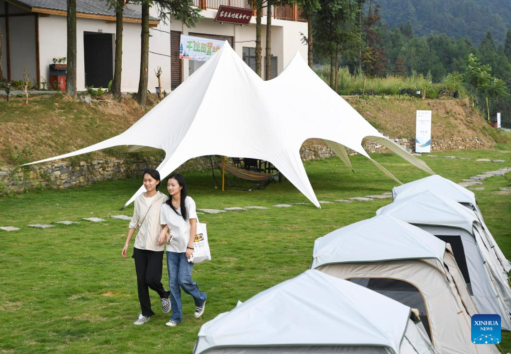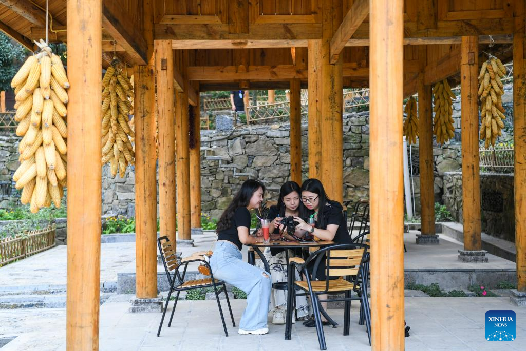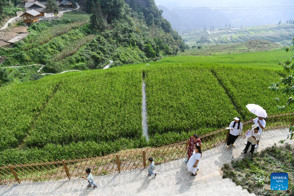 Tourists are pictured in Dingshi Township, Youyang Tujia and Miao Autonomous County, southwest China's Chongqing Municipality, on Aug. 20, 2023. Youyang, one of the key beneficiary counties of state assistance for rural revitalization, has been fully availing of its unique advantages in ecological environment and indigenous tradition to promote converged development of agriculture, culture, and tourism. (Xinhua/Wang Quanchao)