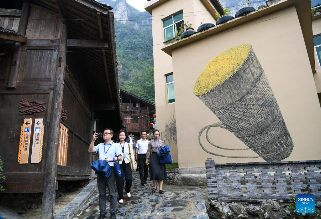 Tourists visit Dingshi Township, Youyang Tujia and Miao Autonomous County, southwest China's Chongqing Municipality, on Aug. 20, 2023. Youyang, one of the key beneficiary counties of state assistance for rural revitalization, has been fully availing of its unique advantages in ecological environment and indigenous tradition to promote converged development of agriculture, culture, and tourism. (Xinhua/Wang Quanchao)