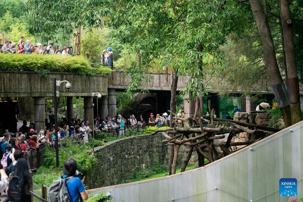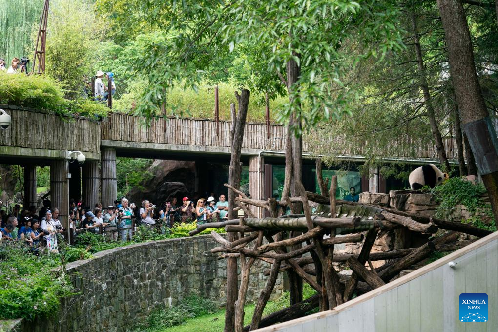 Visitors watch giant panda cub Xiao Qi Ji enjoying an ice cake at Smithsonian's National Zoo in Washington, D.C., the United States, on Aug. 21, 2023. Giant panda cub Xiao Qi Ji celebrated his third birthday at the Smithsonian's National Zoo in Washington, D.C. on Monday. (Xinhua/Liu Jie)