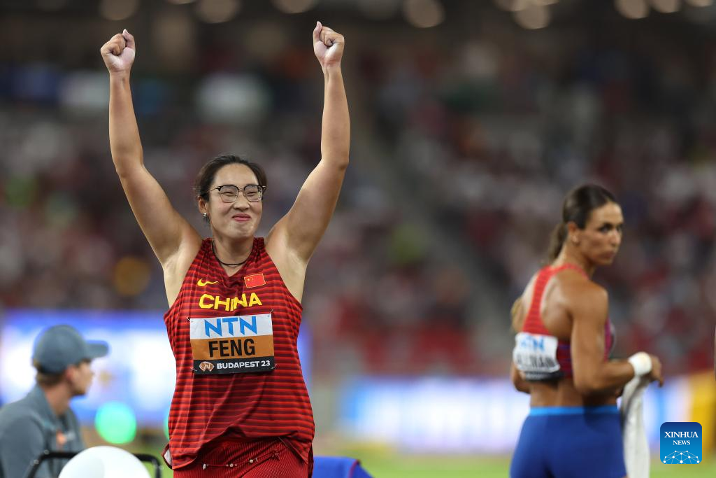 BUDAPEST, Aug. 22 (Xinhua) -- Defending world champion Feng Bin bested her season's record four times, culminating in a throw of 68.20m to secure a bronze in the women's discus throw final at the 2023 World Athletics Championships here on Tuesday.