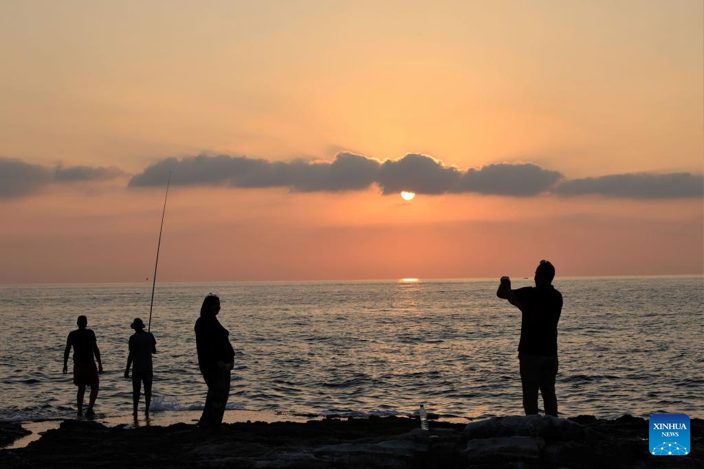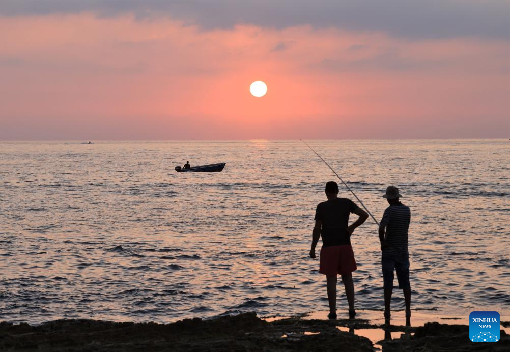 People fish at sunset by the Mediterranean Sea in Beirut, Lebanon, on Aug. 23, 2023. (Xinhua/Liu Zongya)