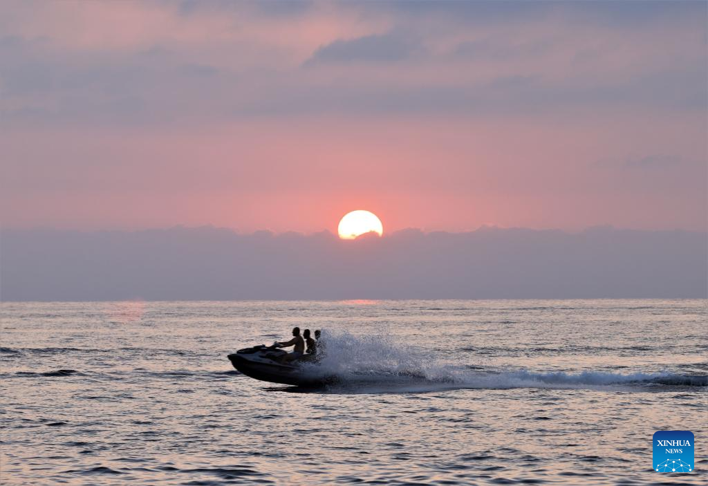 People sail a boat at sunset in the Mediterranean Sea in Beirut, Lebanon, on Aug. 23, 2023. (Xinhua/Liu Zongya)