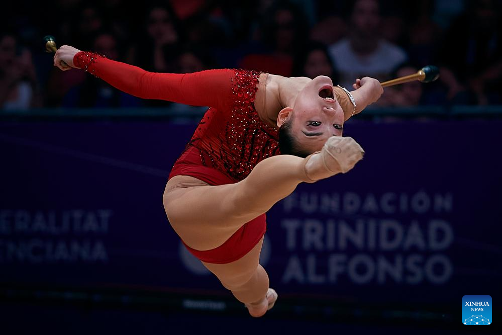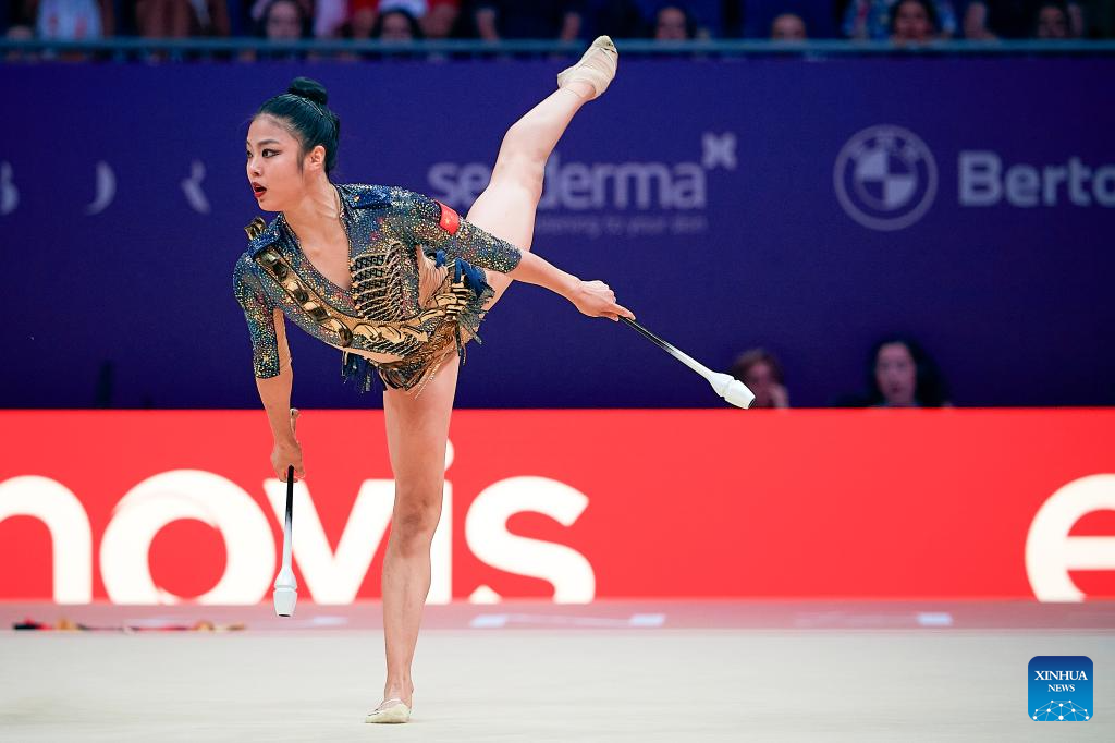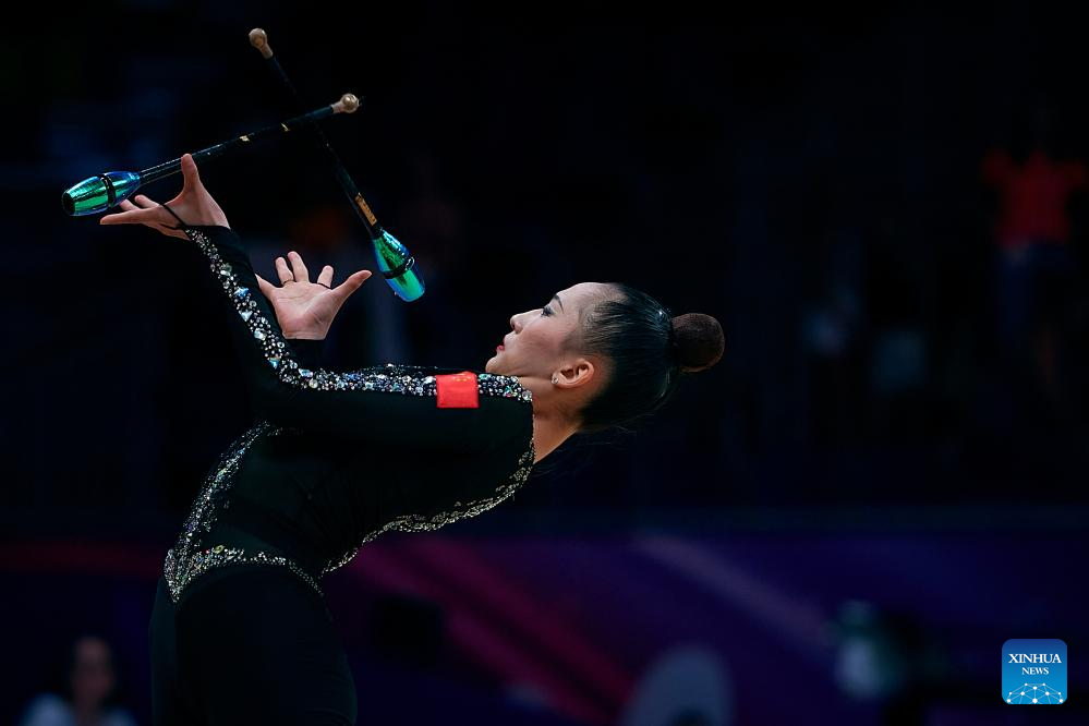 Zhao Yating of China competes during the Individual Clubs Qualification at the 40th FIG Rhythmic Gymnastics World Championships in Valencia, Spain, Aug. 24, 2023. (Photo by Pablo Morano/Xinhua)