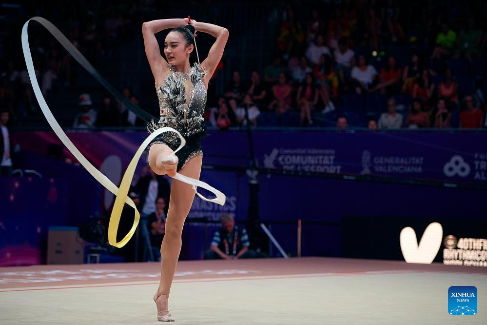 Kita Mirano of Japan competes during the Individual Ribbon Qualification at the 40th FIG Rhythmic Gymnastics World Championships in Valencia, Spain, Aug. 24, 2023. (Photo by Pablo Morano/Xinhua)