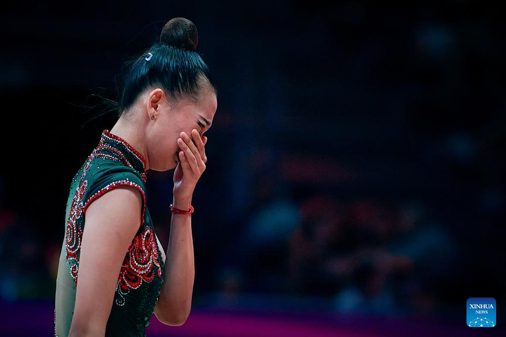 Wang Zilu of China reacts after the Individual Ribbon Qualification at the 40th FIG Rhythmic Gymnastics World Championships in Valencia, Spain, Aug. 24, 2023. (Photo by Pablo Morano/Xinhua)