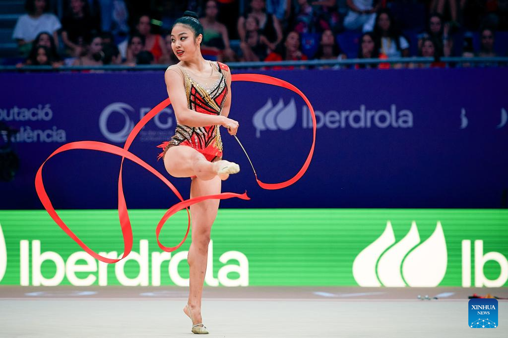 Wang Zilu of China competes during the Individual Ribbon Qualification at the 40th FIG Rhythmic Gymnastics World Championships in Valencia, Spain, Aug. 24, 2023. (Photo by Pablo Morano/Xinhua)