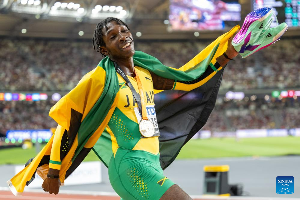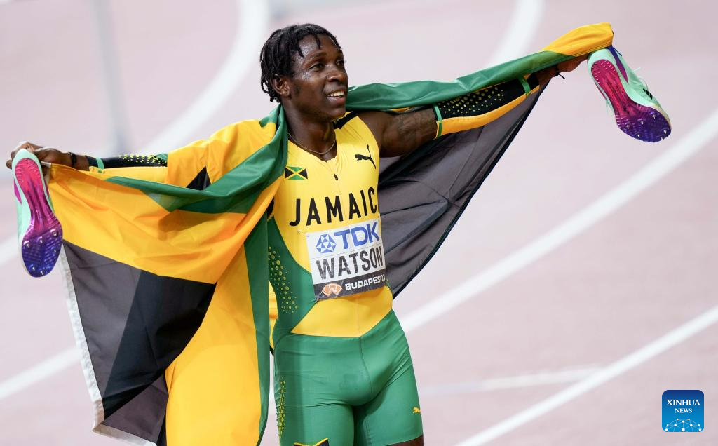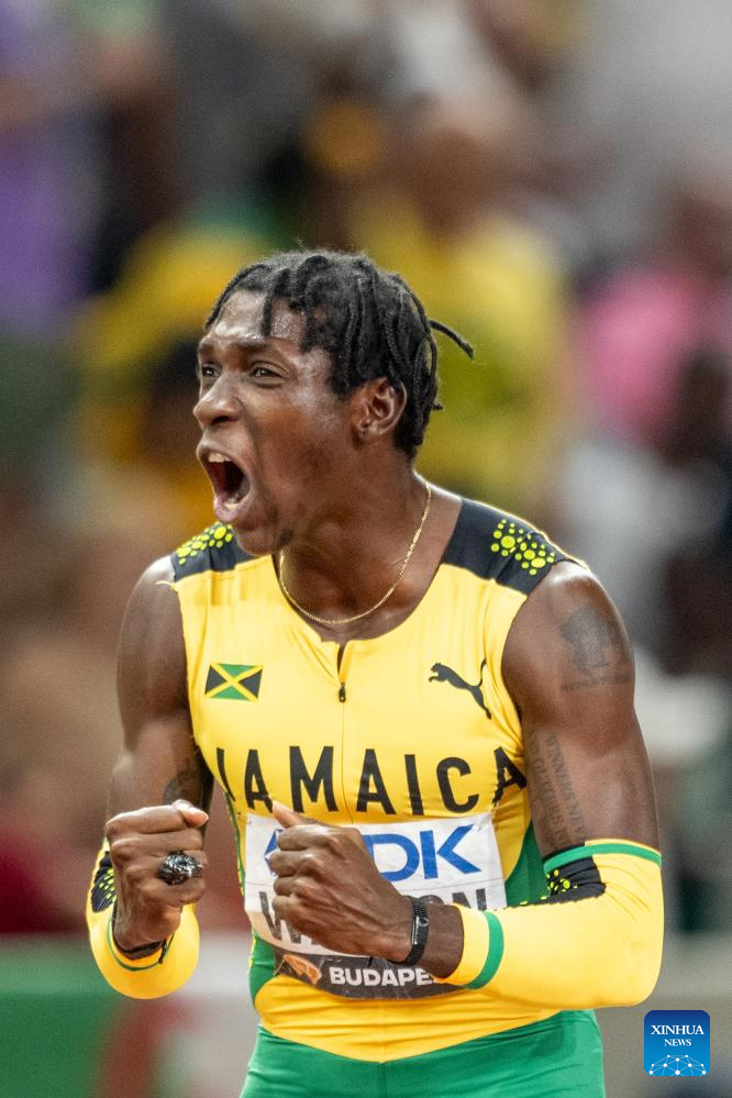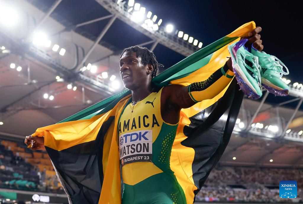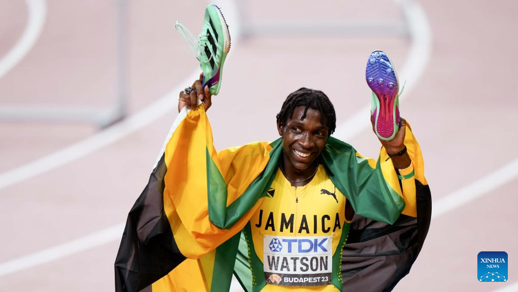 Antonio Watson of Jamaica celebrates after winning the Men's 400m Final of the World Athletics Championships Budapest 2023 in Budapest, Hungary, Aug. 24, 2023. (Xinhua/Wang Lili)