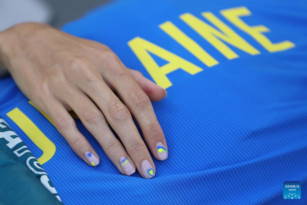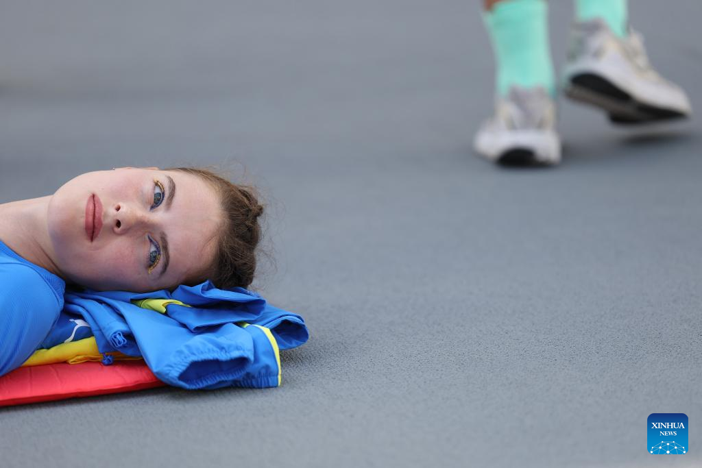 Yaroslava Mahuchikh of Ukraine has a rest during the women's high jump qualification of the World Athletics Championships Budapest 2023 in Budapest, Hungary, Aug. 25, 2023. (Xinhua/Li Ming)